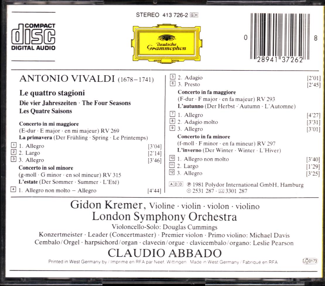 | Artista: | Gidon Kremer,London Symphony Orchestra,Antonio Vivaldi,Claudio Abbado |