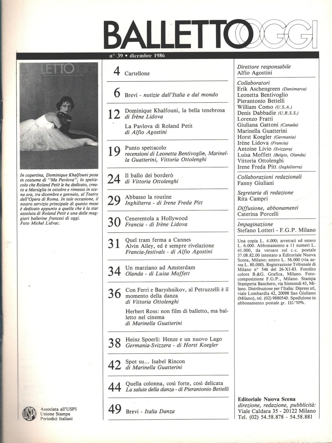 Rivista Balletto Oggi n. 39 – Dicembre 1986 – In copertina Dominique Khalfouni ed. Nuova Scena