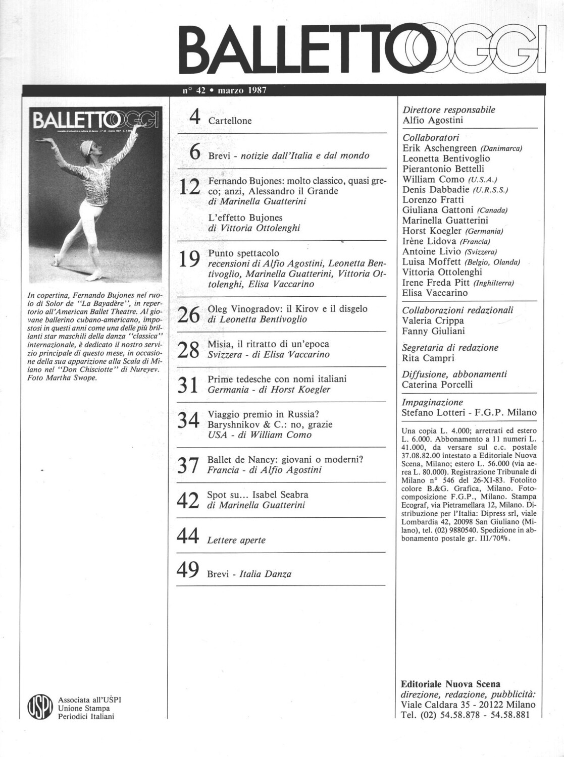 | Titolo: | Rivista Balletto Oggi n. 42 – Marzo 1987 – In copertina Fernando Bujones ed. Nuova Scena |
