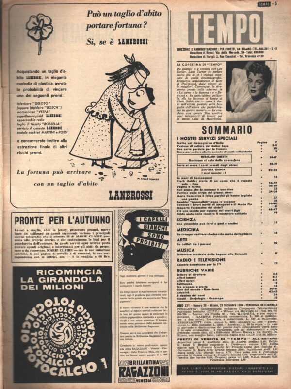 | Titolo: | Rivista Tempo n. 38 del 23 Settembre 1954 – In copertina Lana Turner |