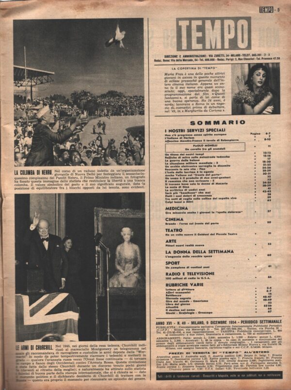 | Titolo: | Rivista Tempo n. 49 del 9 Dicembre 1954 – In copertina Maria Frau |