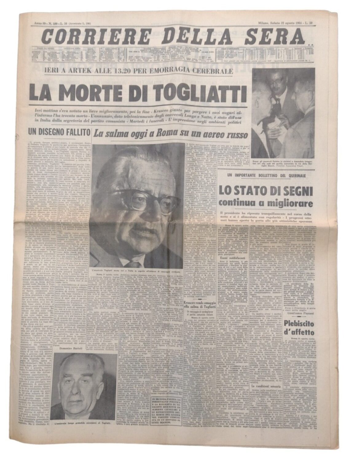 | Titolo: | Corriere della Sera n. 189 – 22 agosto 1964 anno 89 – La morte di Togliatti |