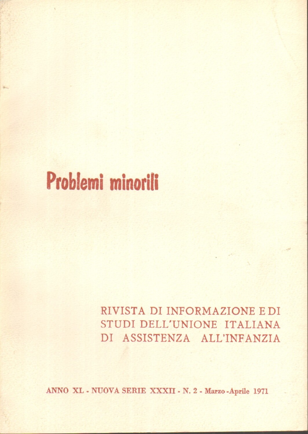 | Titolo: | Rivista Problemi Minorili Anno XL Nuova Serie n. 2 – Marzo, Aprile 1971 ed. Unione Italiana di Assistenza all’Infanzia |