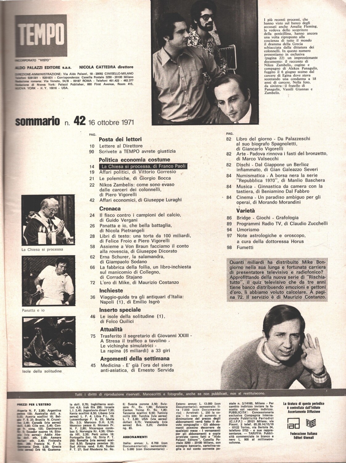 | Titolo: | Rivista Tempo n. 42 del 15 Ottobre 1971 – In copertina Erna Schurer |