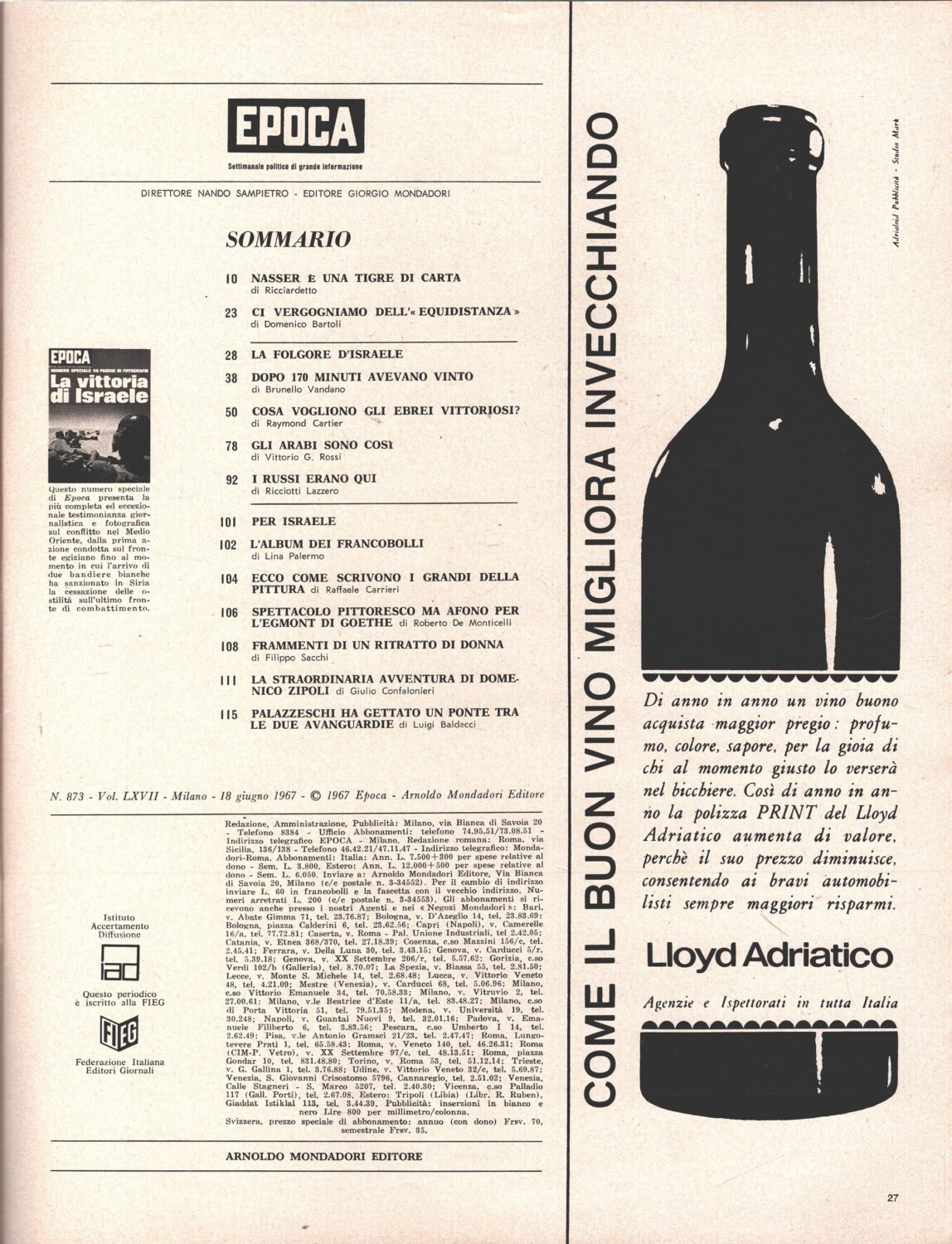 Rivista Epoca n. 873 del 18 Giugno 1967 – In copertina La vittoria di Israele