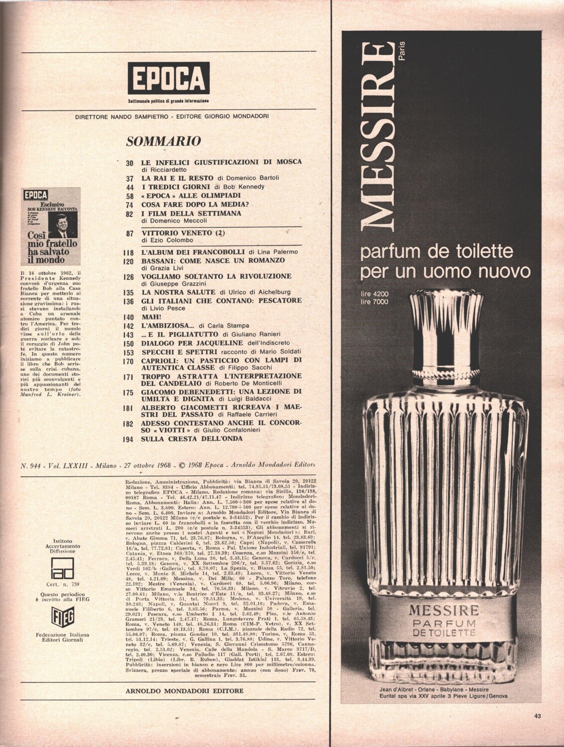 | Titolo: | Rivista Epoca n. 944 del 27 Ottobre 1968 – In copertina Kennedy |