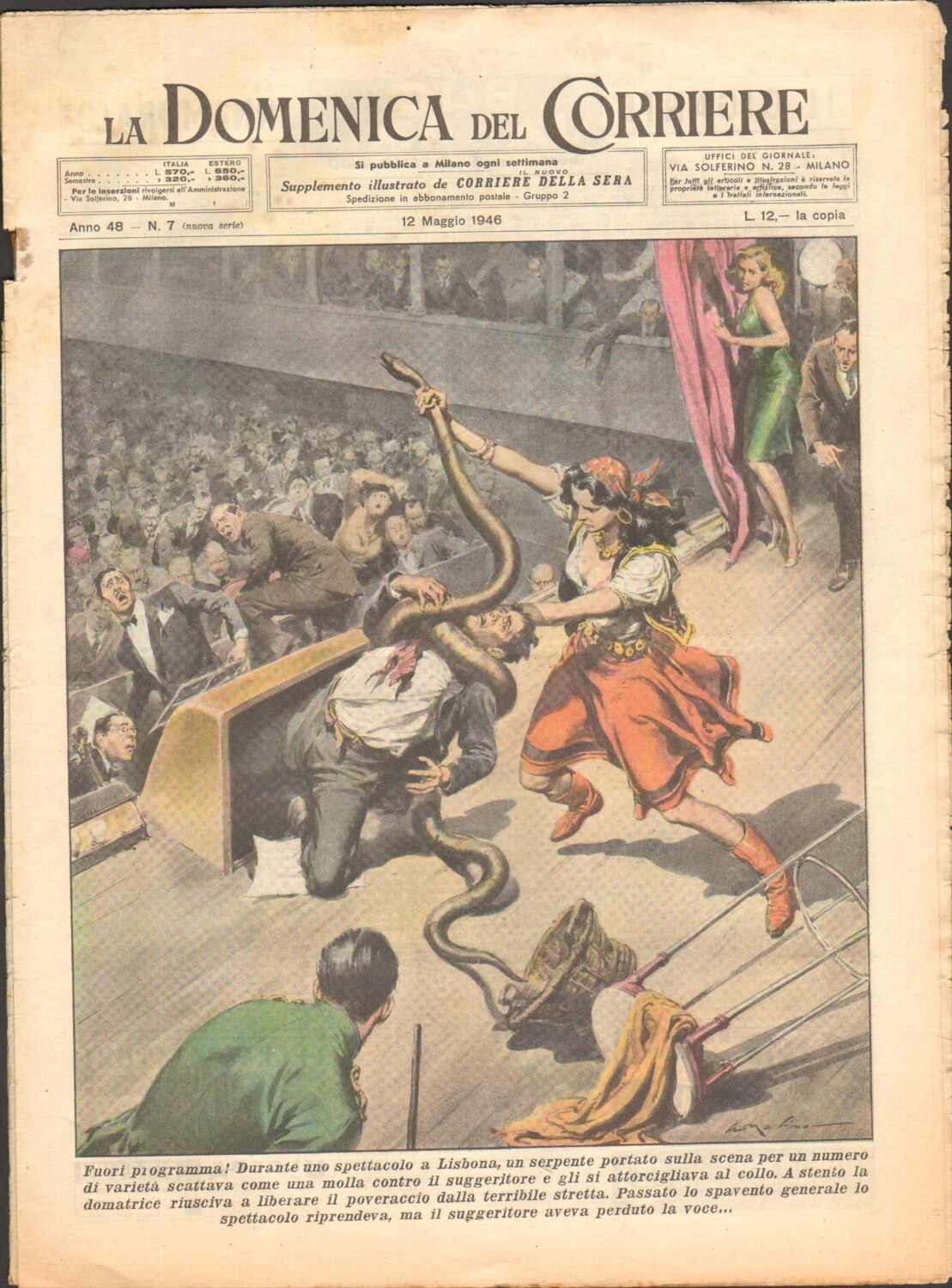 Illustrato in copertina (segue foto): Durante uno spettacolo a Lisbona un serpente portato sulla scena scattava contro il suggeritore e gli si attorcigliava al collo. A stento la domatrice riusciva a liberare il poveraccio dalla terribile stretta