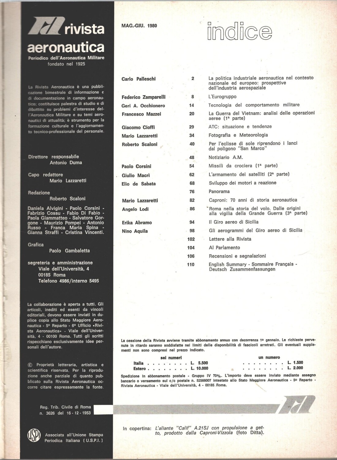 | Titolo: | Rivista Aeronautica n. 3 – Maggio Giugno 1980 – In copertina Aliante Calif A.21SJ ed. Aeronautica Militare |