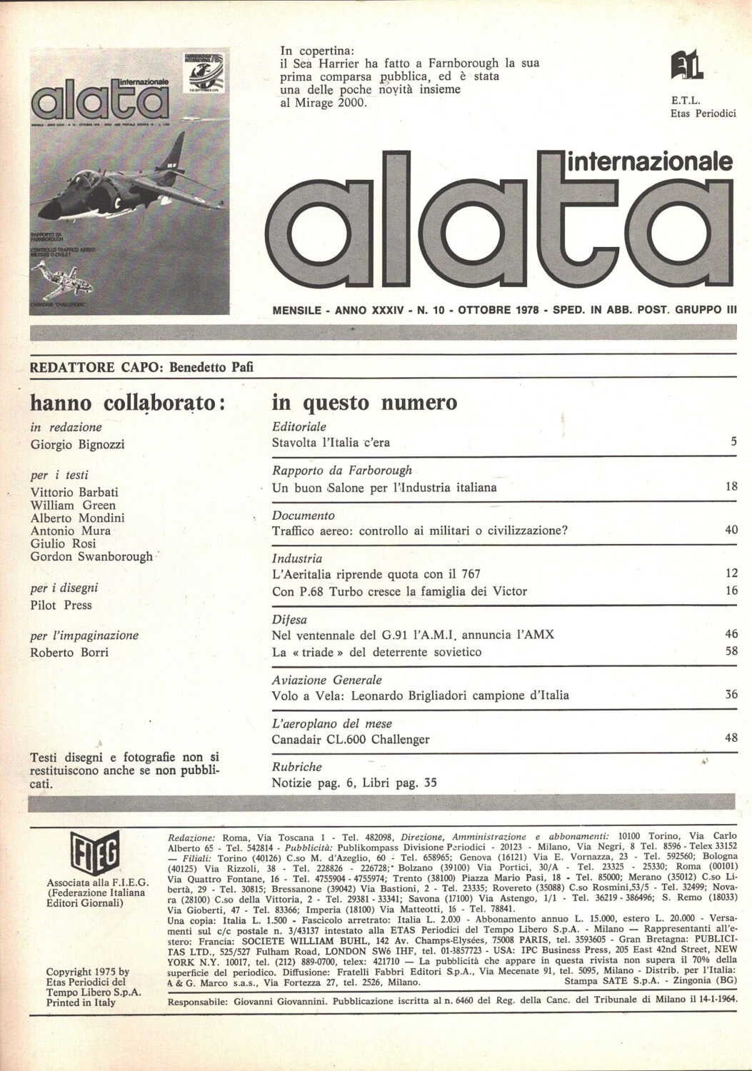 | Titolo: | Rivista Alata internazionale n. 10 – Ottobre 1978 – In copertina Sea Harrier ed. Ed.A.I. |