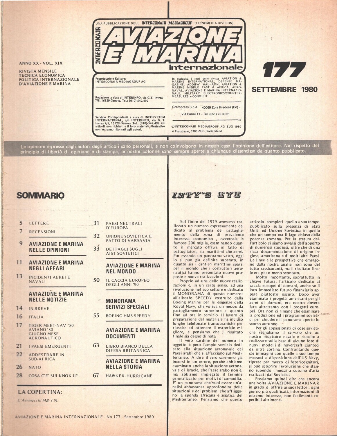 Rivista Aviazione e Marina n. 177 – Settembre 1980 – In copertina Aermacchi MB 339 ed. Interconair