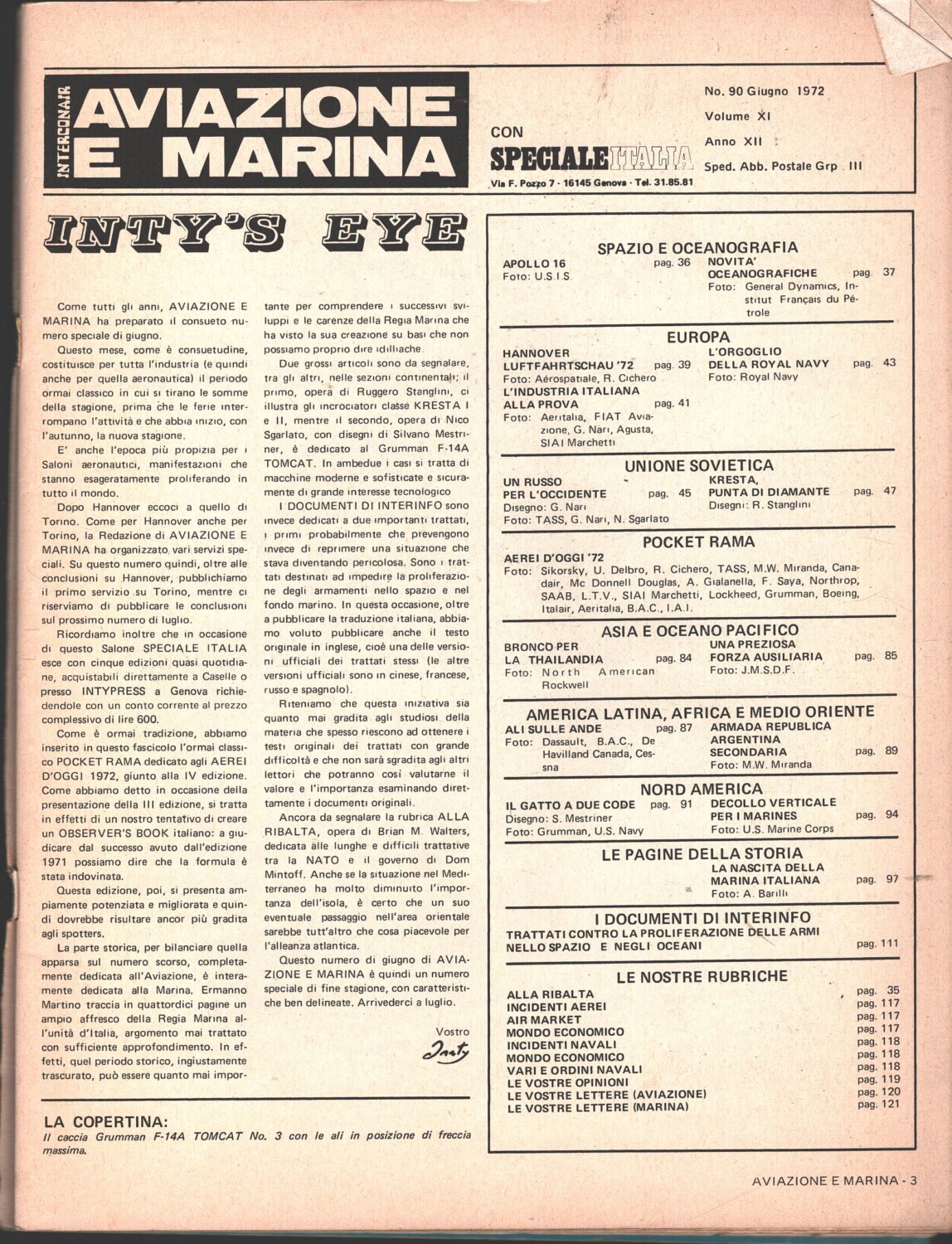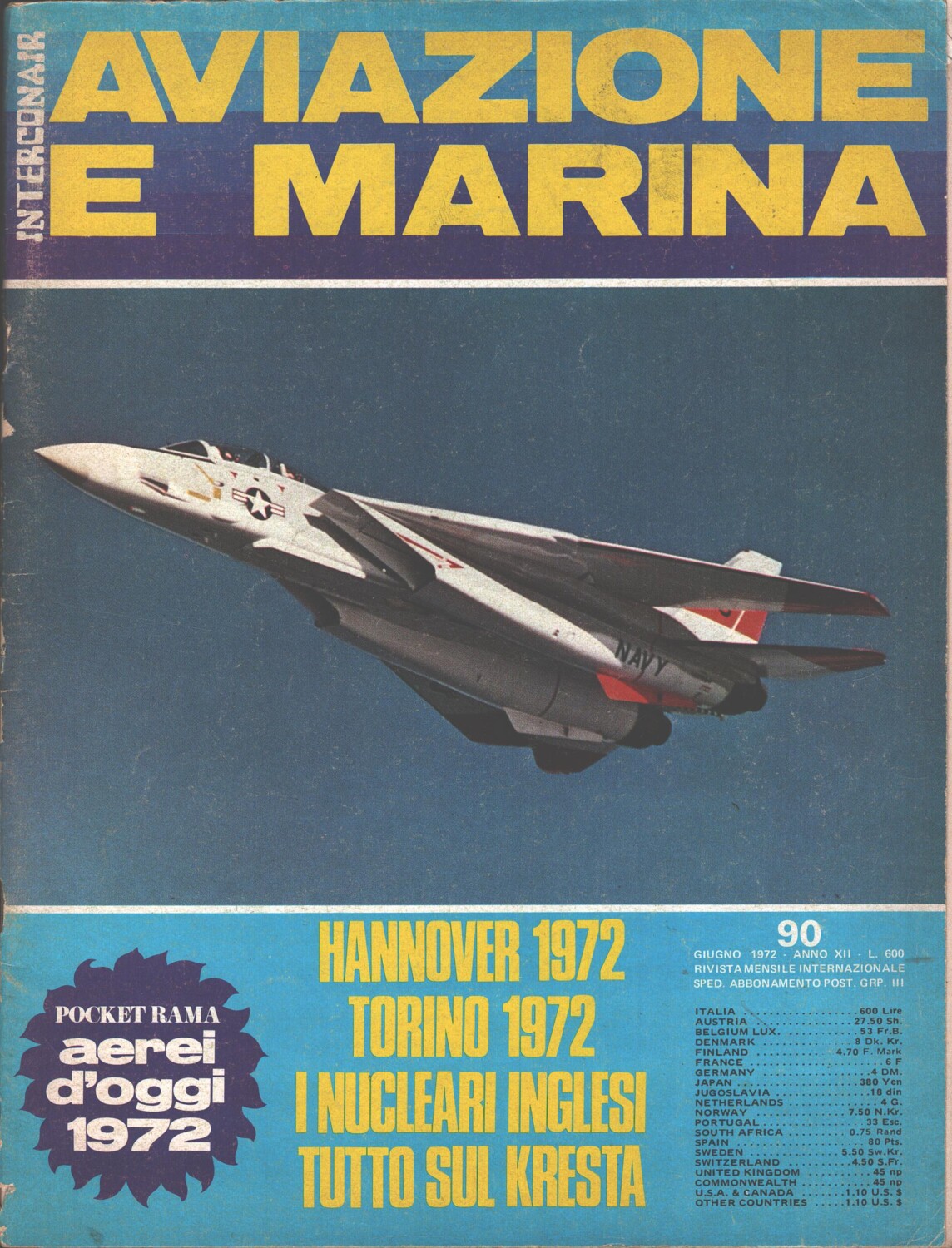 | Titolo: | Rivista Aviazione e Marina n. 90 – Giugno 1972 – In copertina Caccia Grumman F-14A Tomcat ed. Interconair |