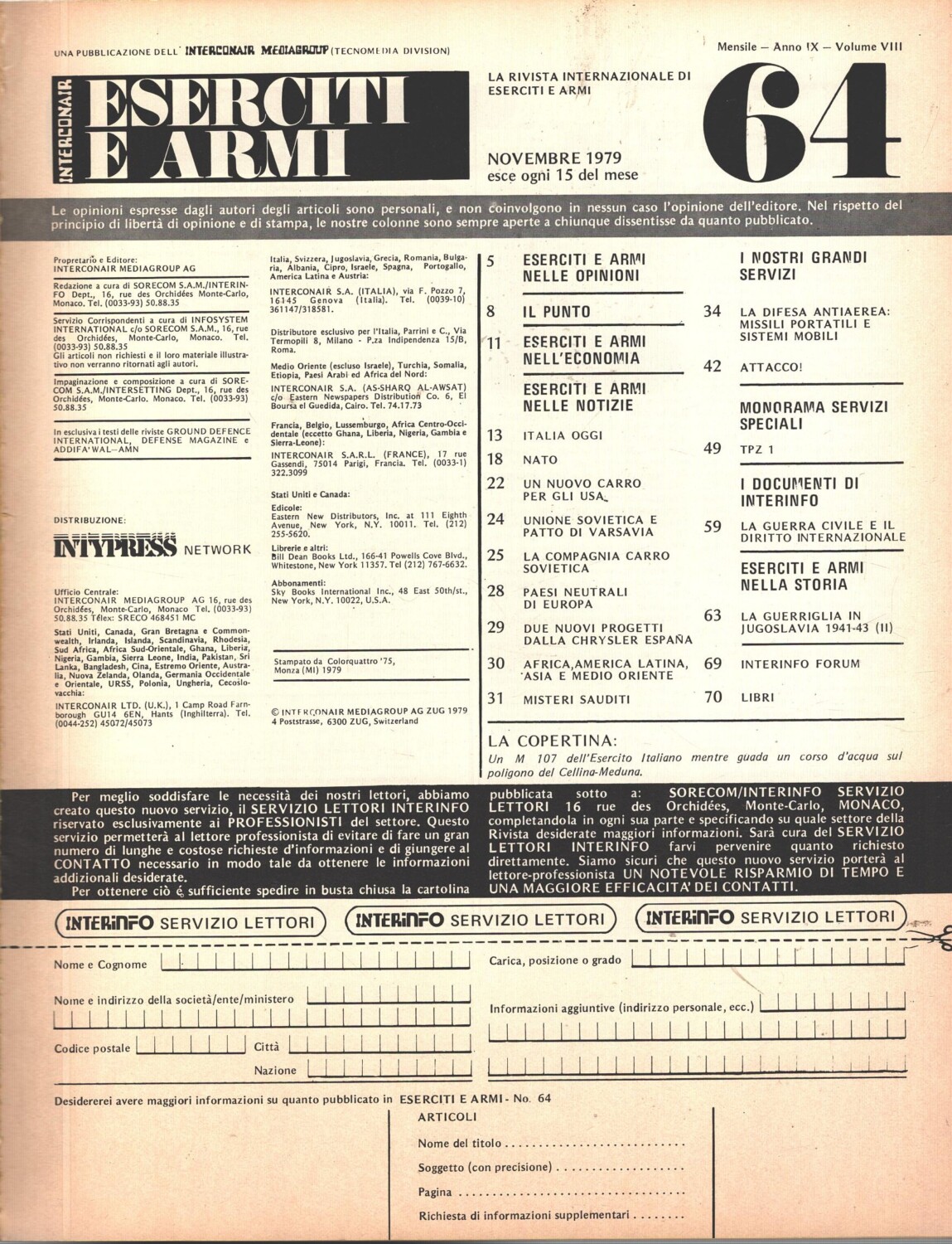 Rivista Eserciti e Armi n. 64 – Novembre 1979 – In copertina M 107 Esercito Italiano ed. Interconair