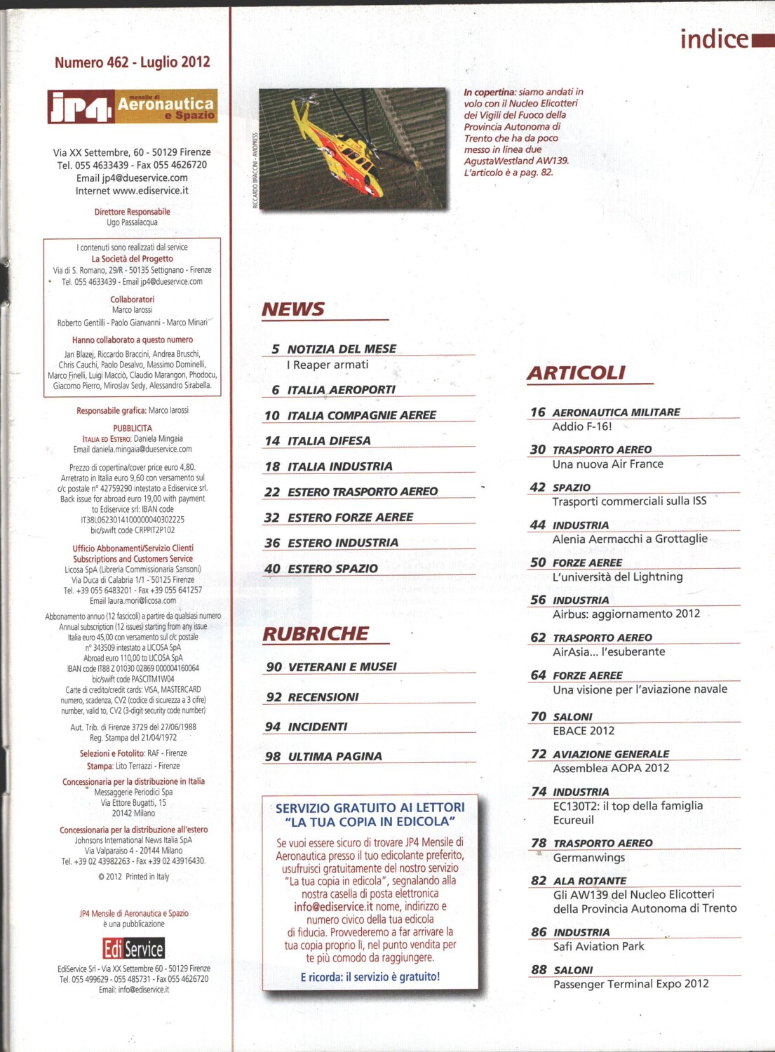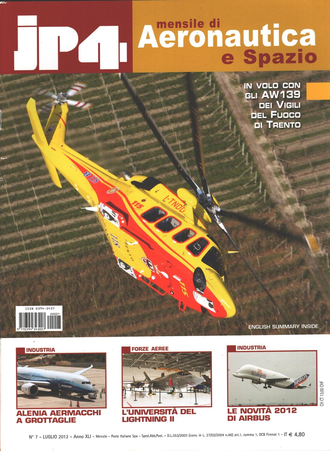 Rivista JP4 Aeronautica e Spazio n. 7 – Luglio 2012 – In copertina Agusta Westland AW139 ed. EdiService