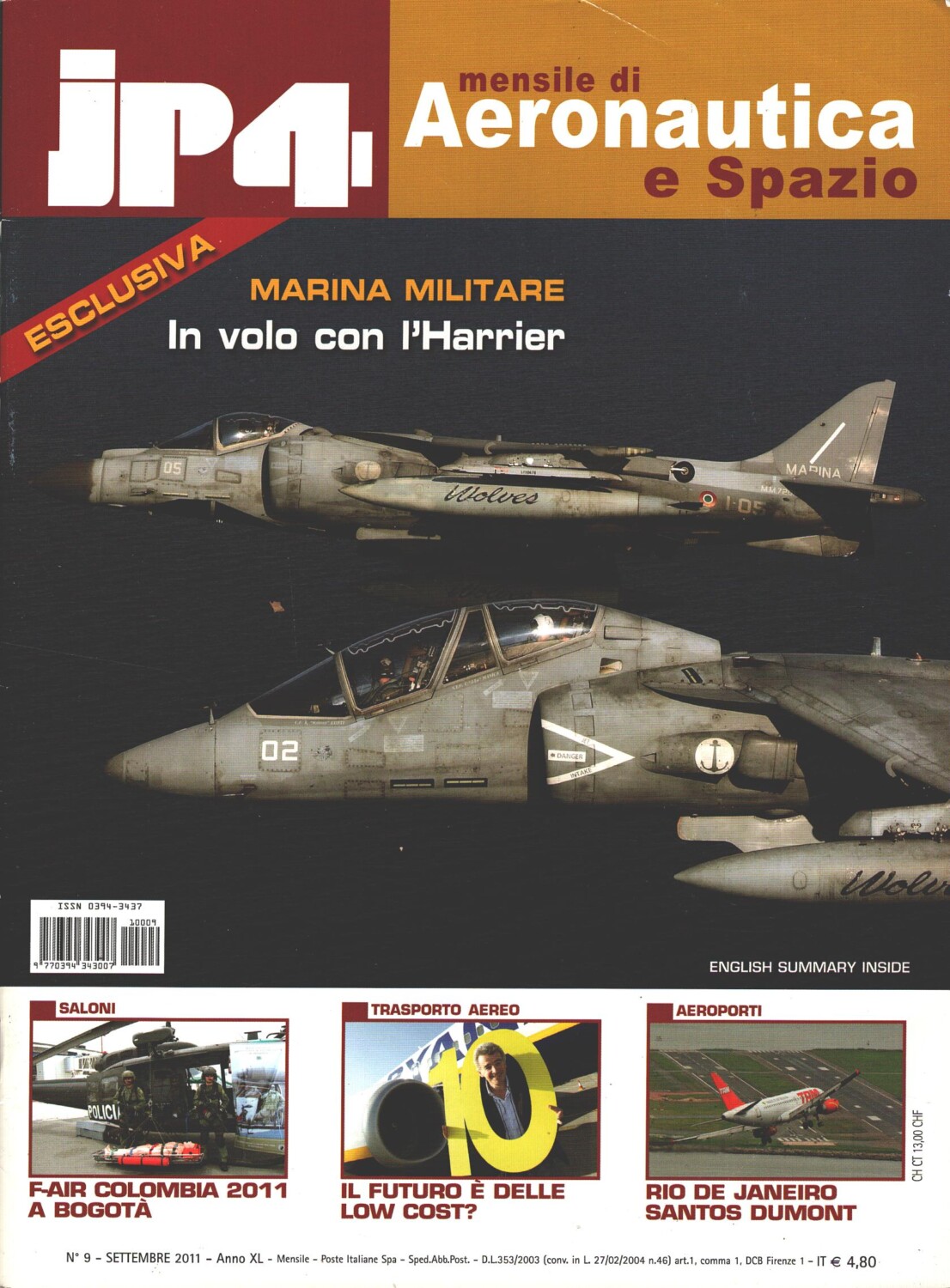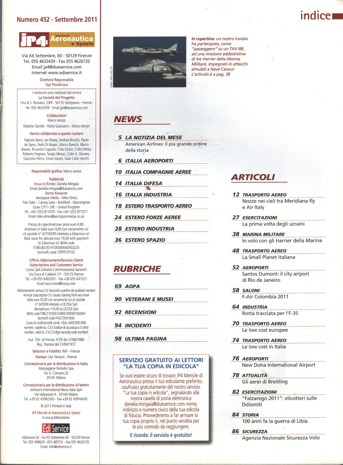 | Titolo: | Rivista JP4 Aeronautica e Spazio n. 9 – Settembre 2011 – In copertina TAV-8B ed. EdiService |
