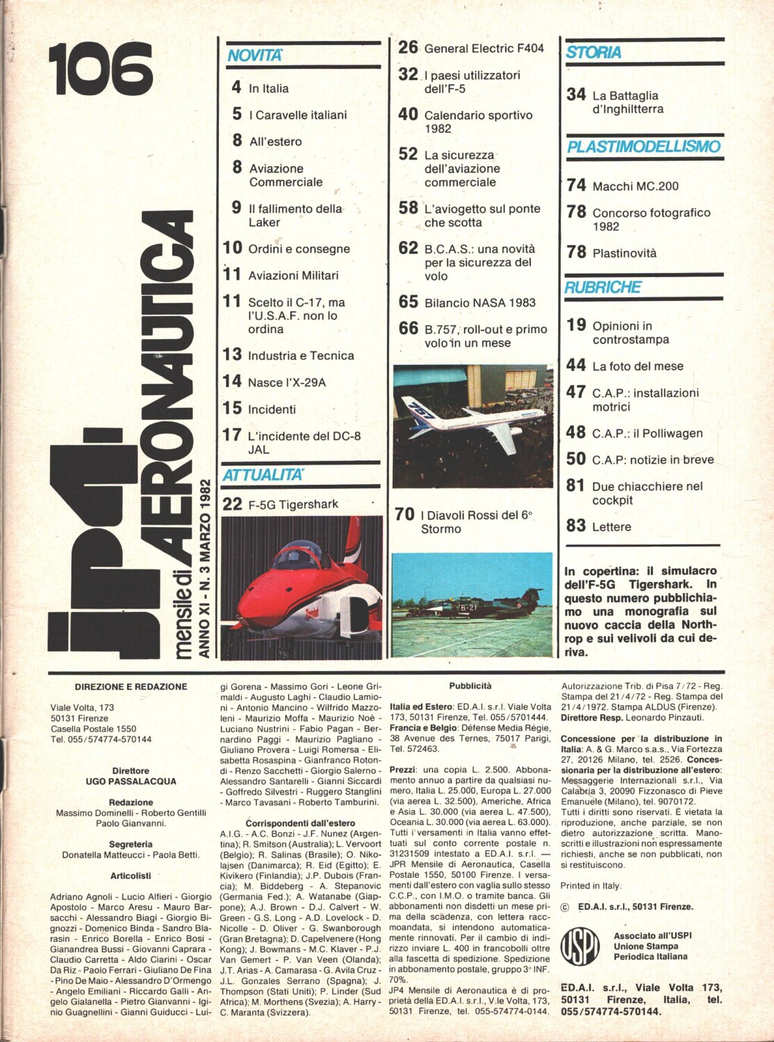 | Titolo: | Rivista JP4 Aeronautica – n. 3 – Marzo 1982 – In copertina F-5 Tigershark il simulacro ed. A.I. |