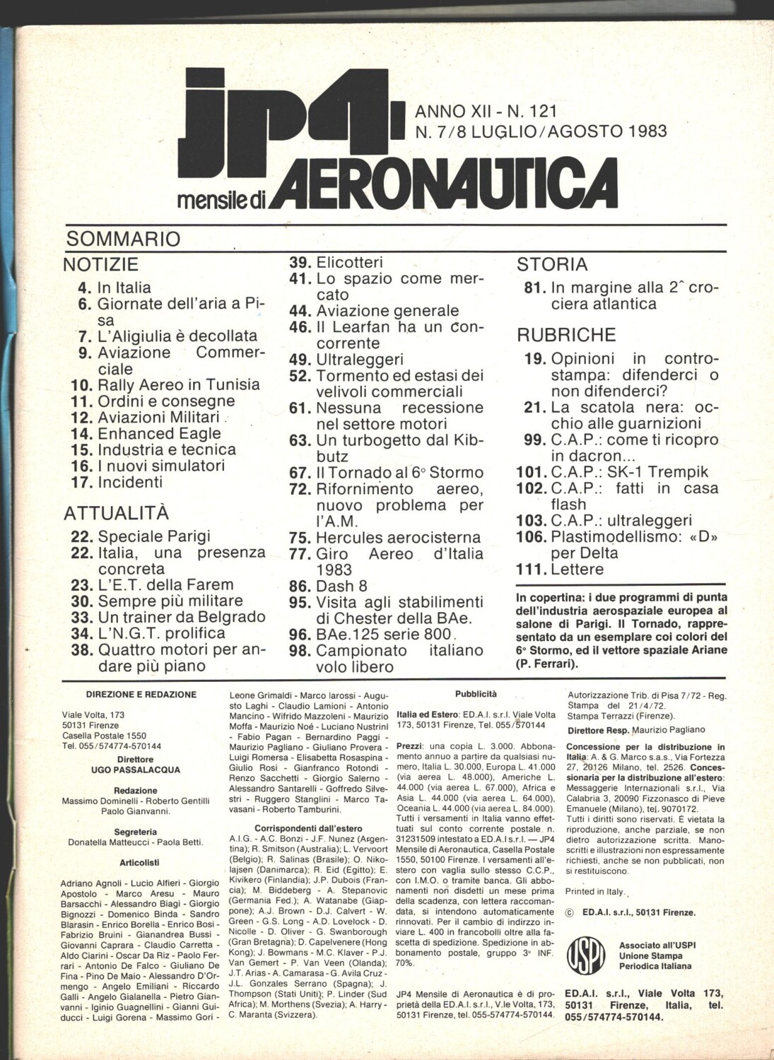 | Titolo: | Rivista JP4 Aeronautica – n. 7/8 – Luglio Agosto 1983 – In copertina Tornado 6° Stormo ed. A.I. |