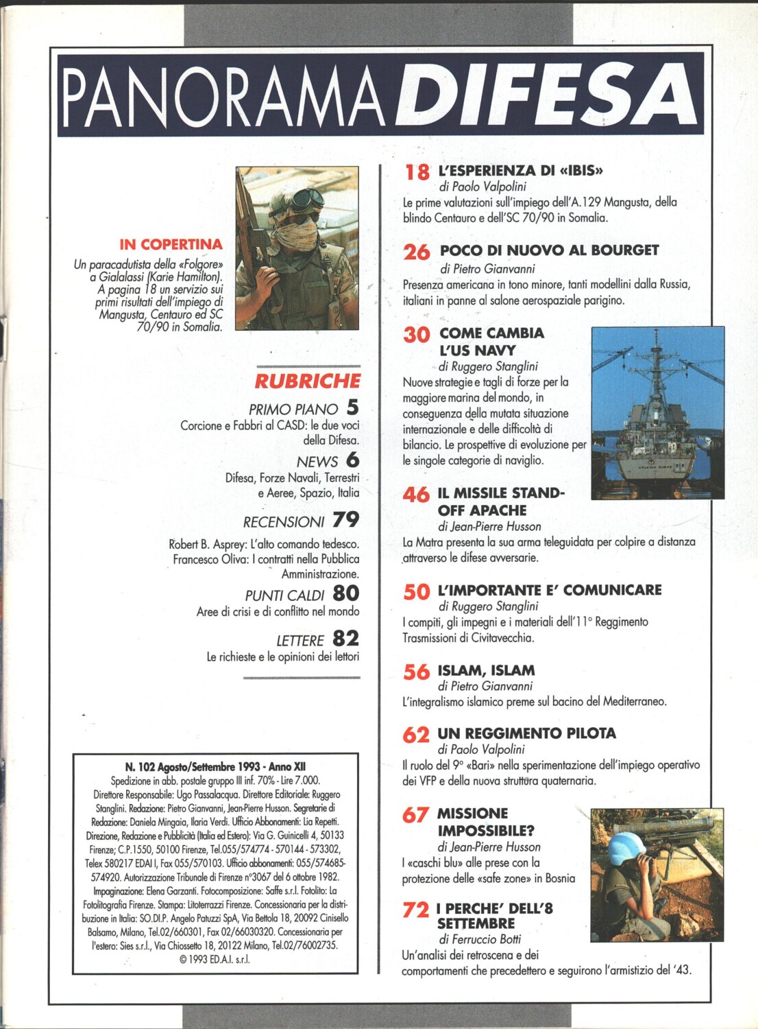 | Titolo: | Rivista Panorama Difesa n. 102 – Agosto Settembre 1993 – In copertina paracadutisa Folgore ed. ED.A.I. |