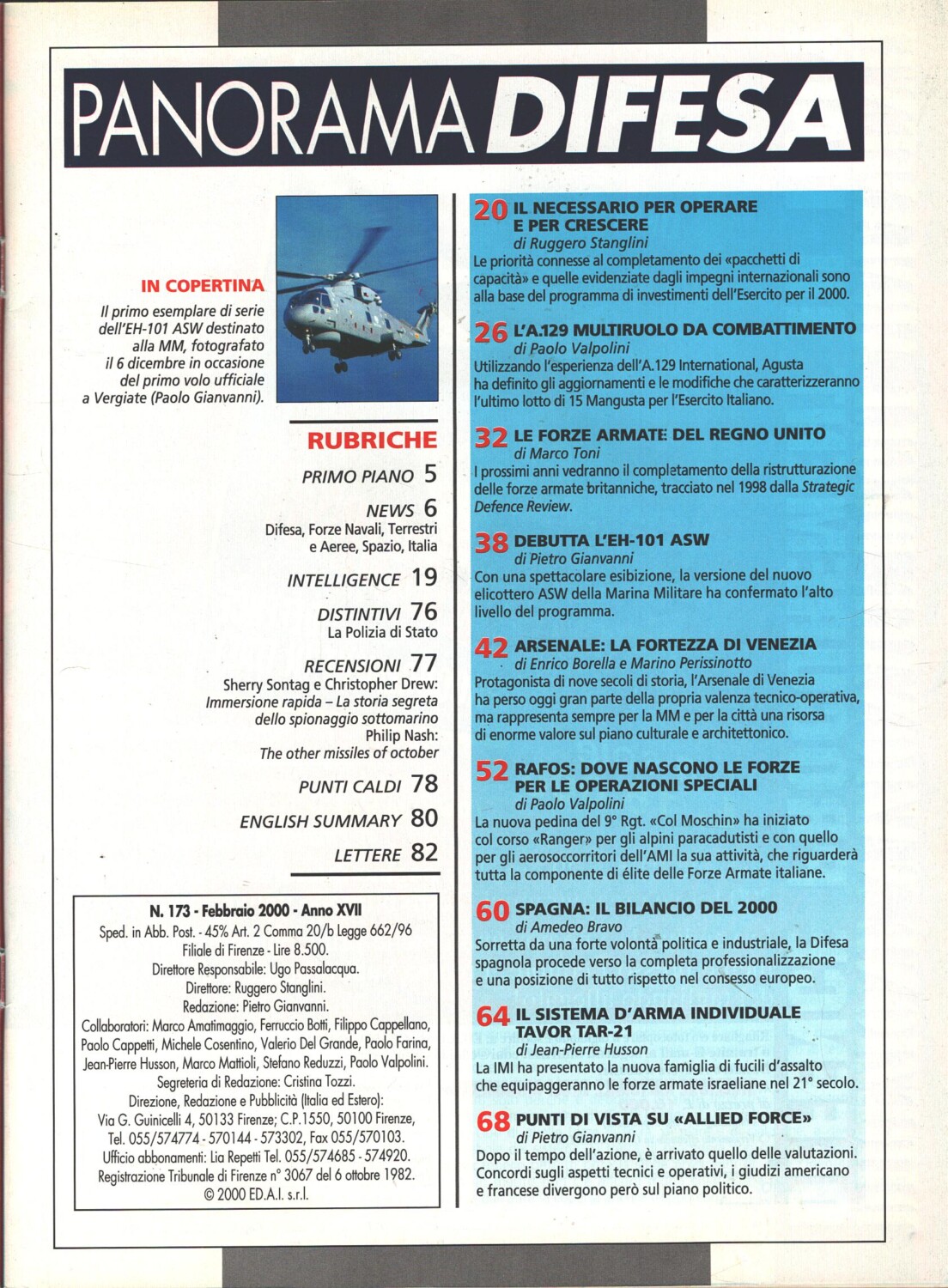 | Titolo: | Rivista Panorama Difesa n. 173 – Febbraio 2000 – In copertina EH-101 ASW ed. ED.A.I. |