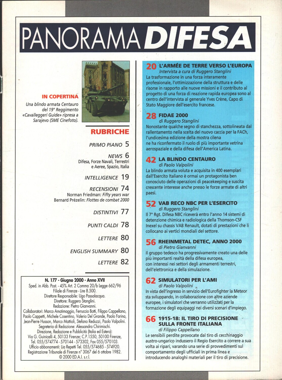 | Titolo: | Rivista Panorama Difesa n. 177 – Giugno 2000 – In copertina blindo armata Centauro ed. ED.A.I. |