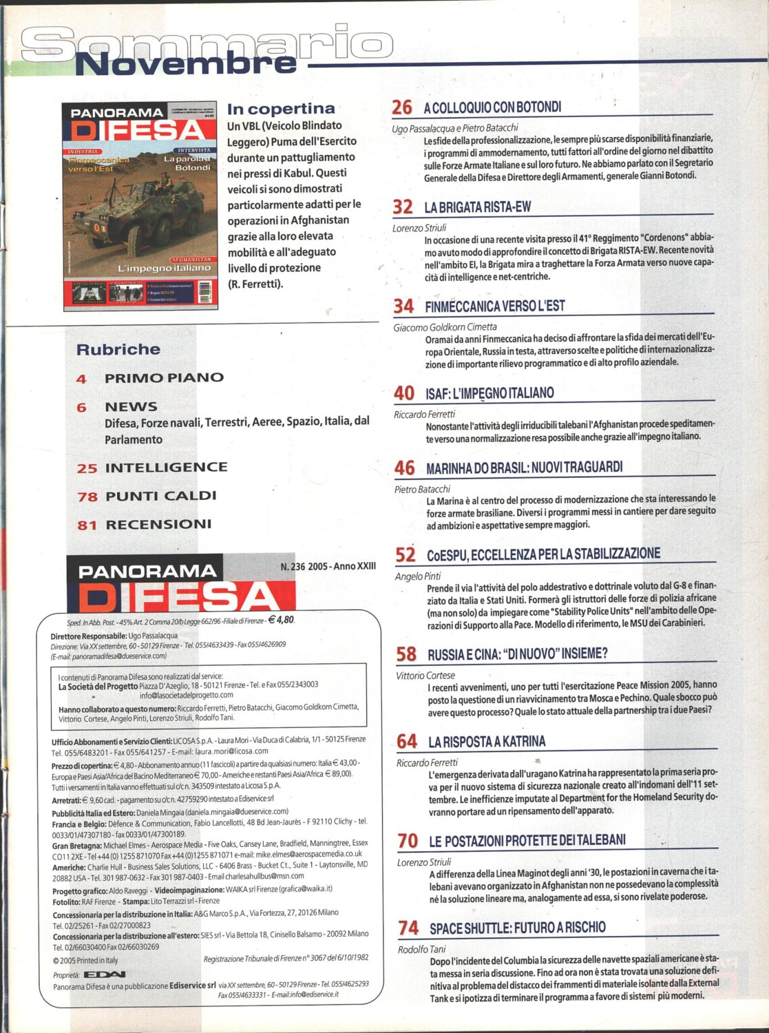 Rivista Panorama Difesa n. 236 – Novembre 2005 – In copertina VBL veicolo blindato leggero ed. ED.A.I.