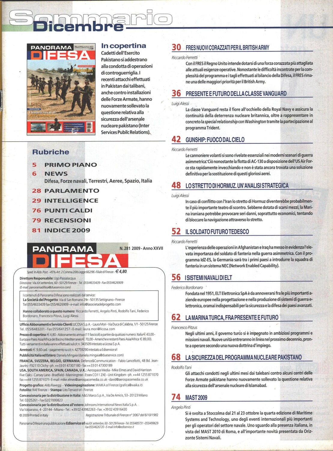 Rivista Panorama Difesa n. 281 – Dicembre 2009 – In copertina Cadetti Esercito Pakistano ed. ED.A.I.