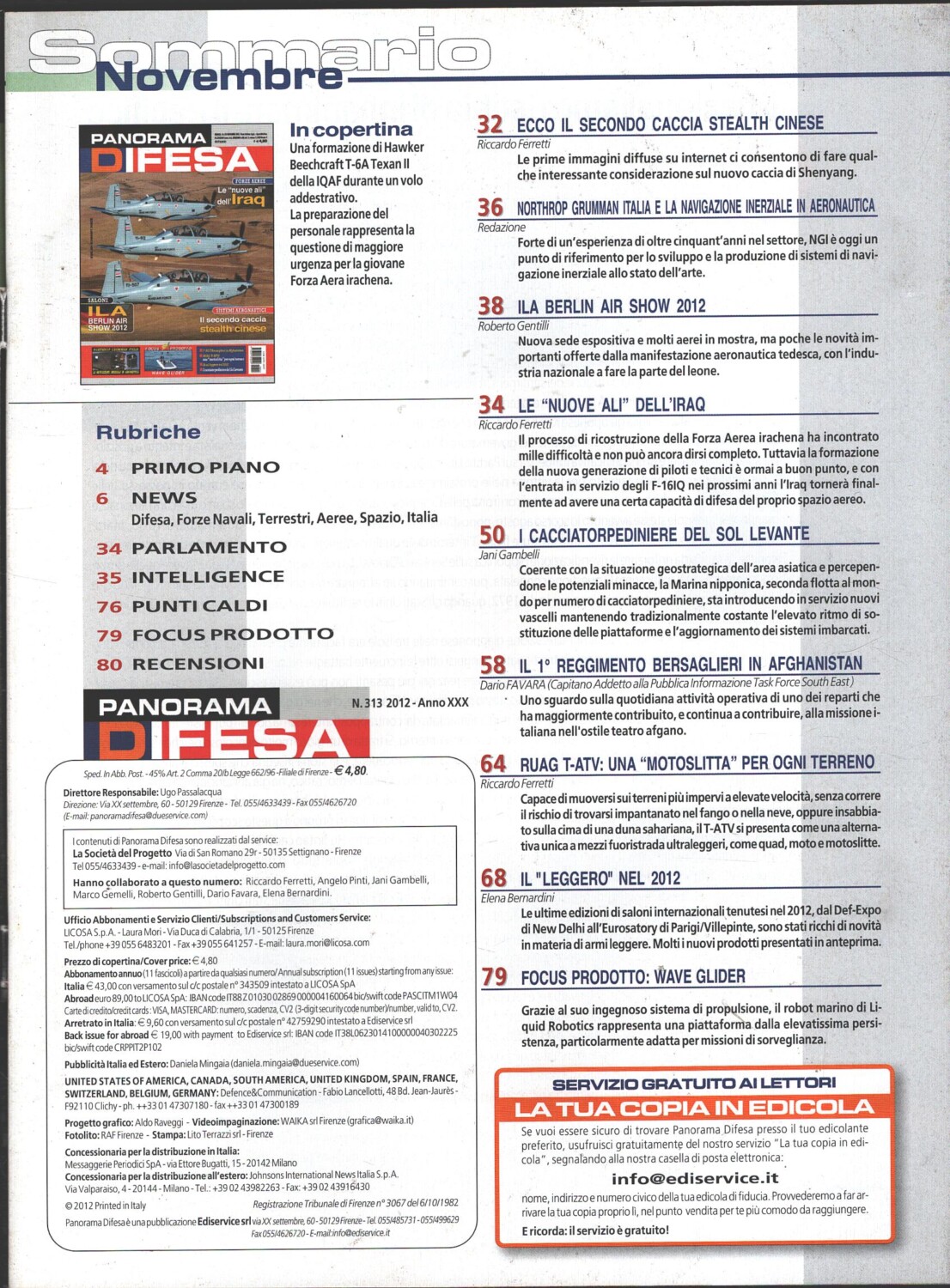 | Titolo: | Rivista Panorama Difesa n. 313 – Novembre 2012 – In copertina Hawker Beechcraft T-6A Texan ed. ED.A.I. |