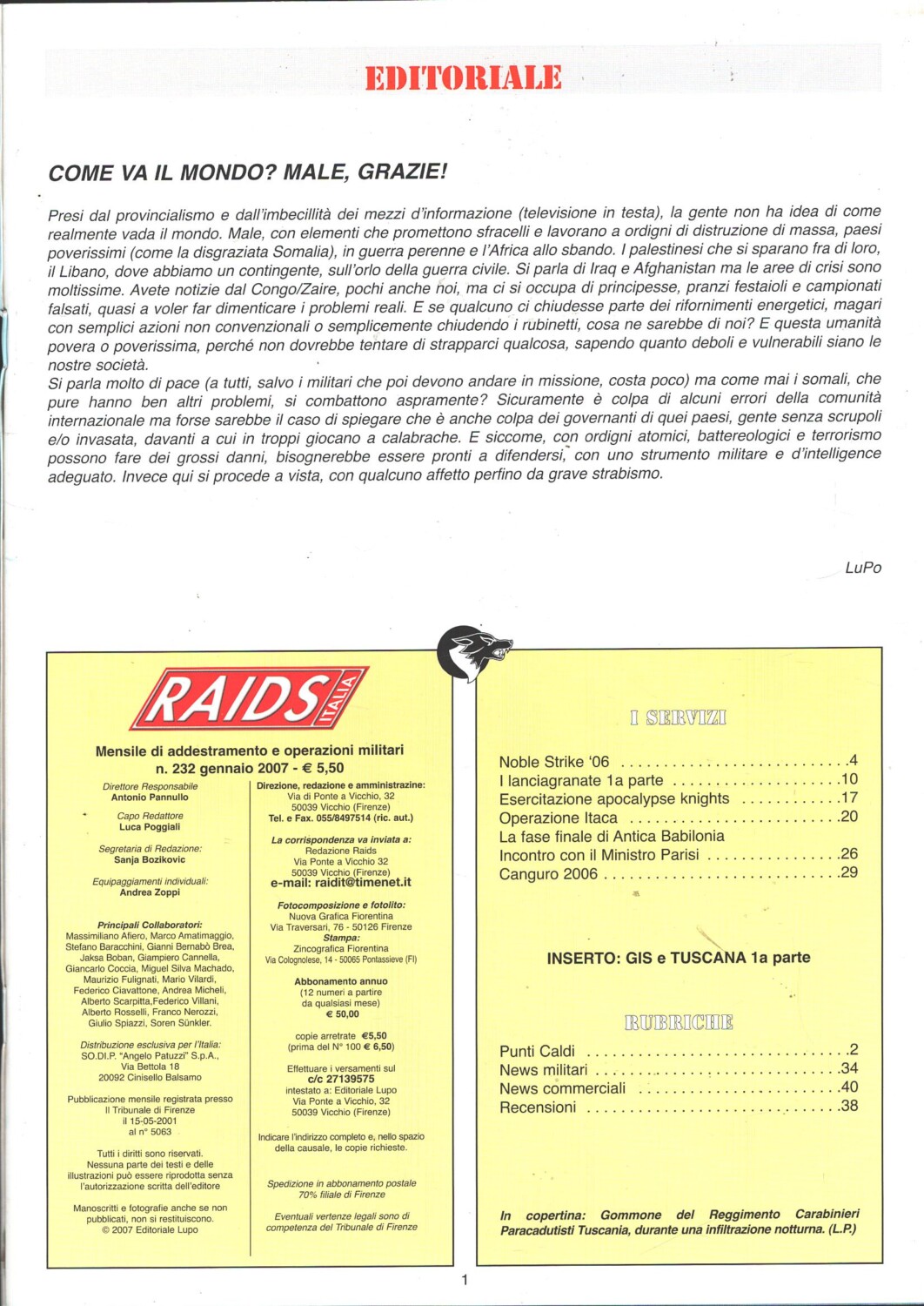 | Titolo: | Rivista Raids Italia n. 232 – Gennaio 2007 – In copertina Reggimento Carabinieri Paracadutisti Tuscania ed. Editoriale Lupo |
