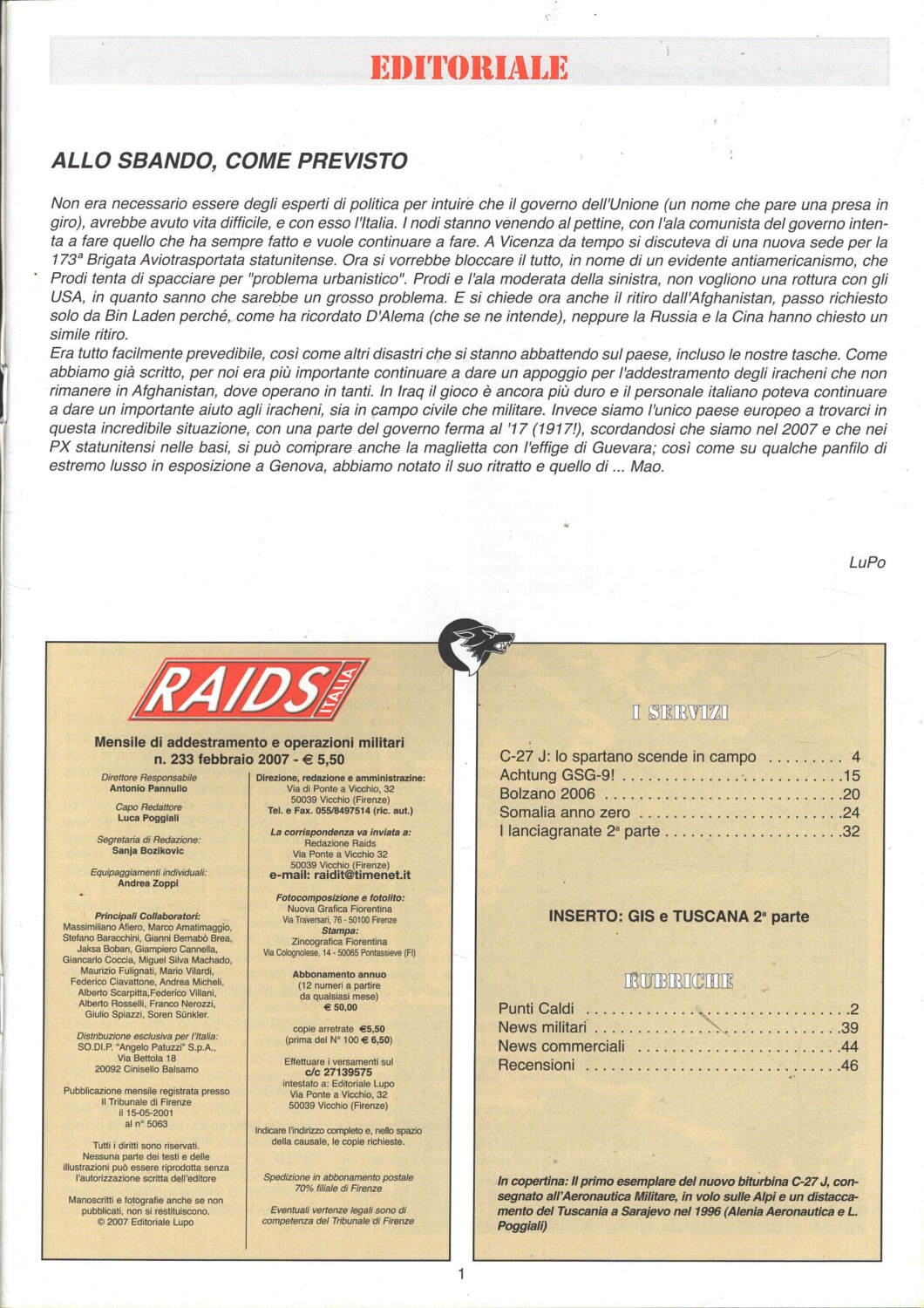 | Titolo: | Rivista Raids Italia n. 233 – Febbraio 2007 – In copertina C-27 J biturbina ed. Editoriale Lupo |