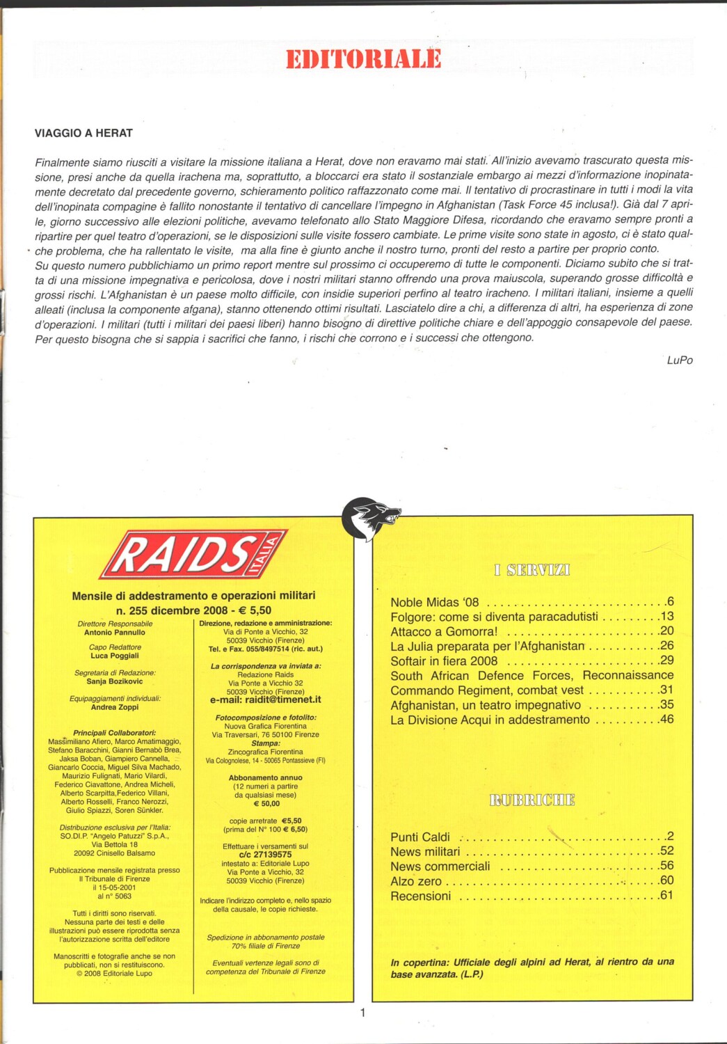 | Titolo: | Rivista Raids Italia n. 255 – Dicembre 2008 – In copertina Ufficiale degli Alpini ed. Editoriale Lupo |