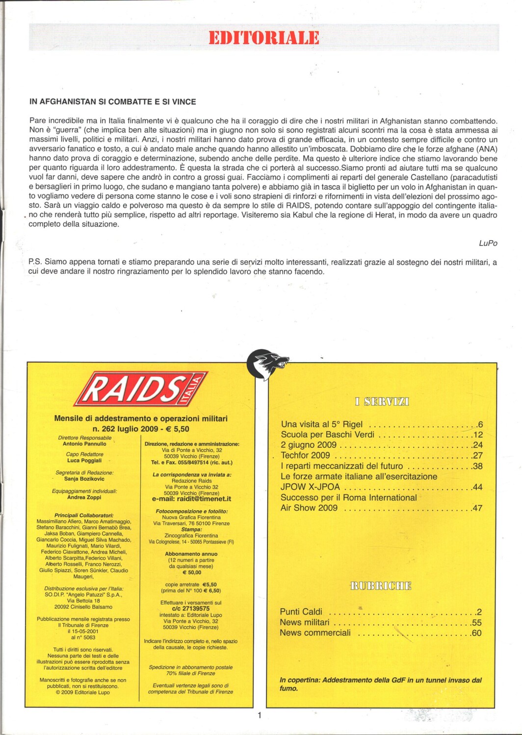 Rivista Raids Italia n. 262 – Luglio 2009 – In copertina addestramento GdF ed. Editoriale Lupo