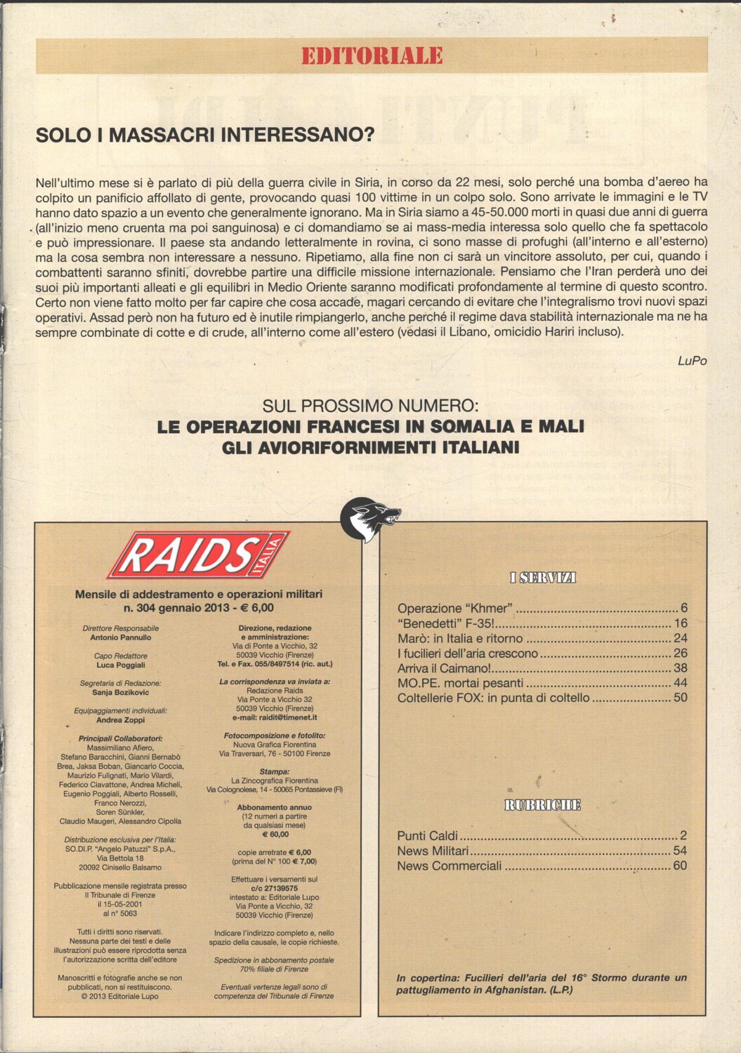 | Titolo: | Rivista Raids Italia n. 304 – Gennaio 2013 – In copertina fucilieri 16° Stormo ed. Editoriale Lupo |