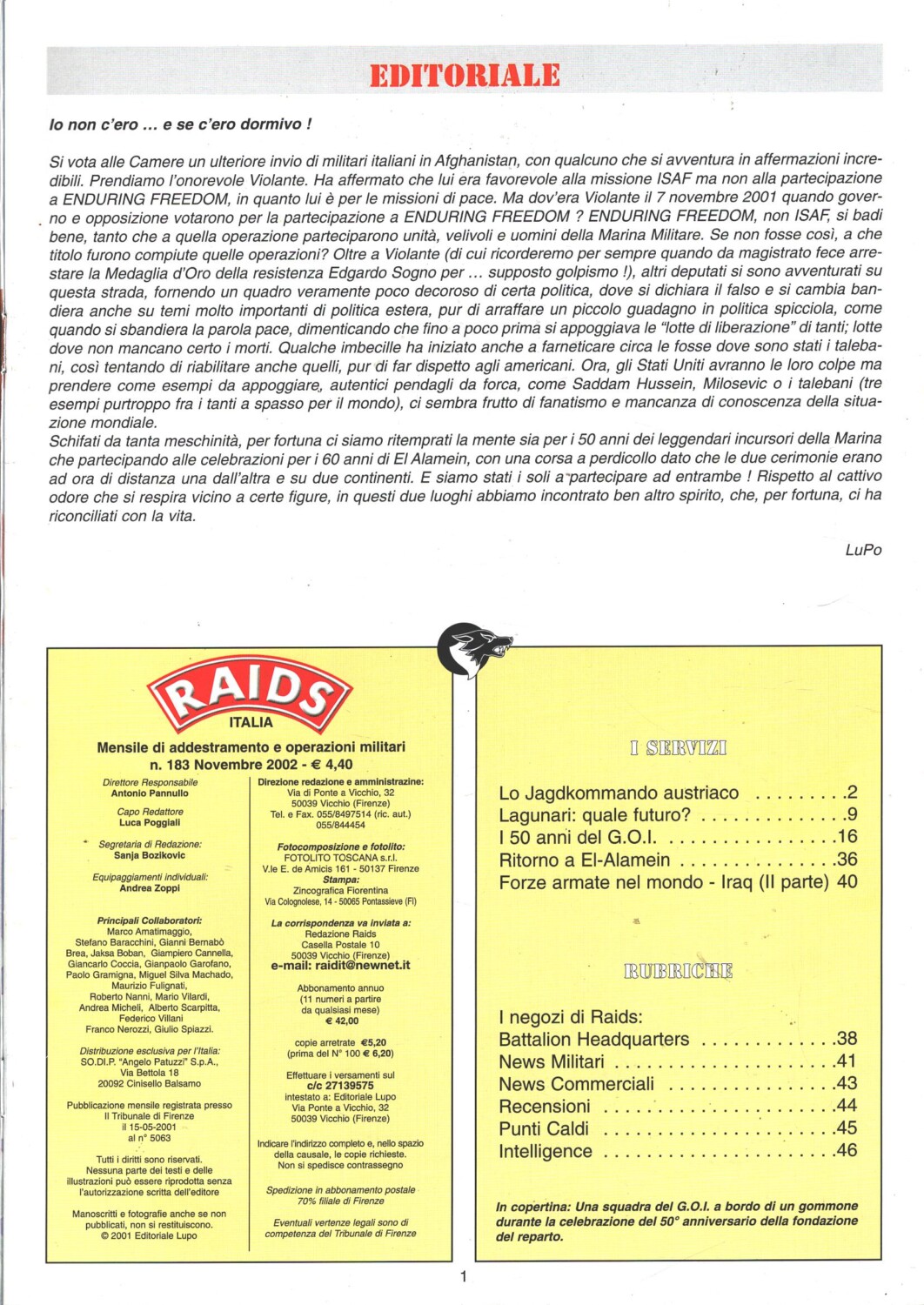 | Titolo: | Rivista Raids n. 183 – Novembre 2002 – In copertina squadra del G.O.I. ed. Albertelli |