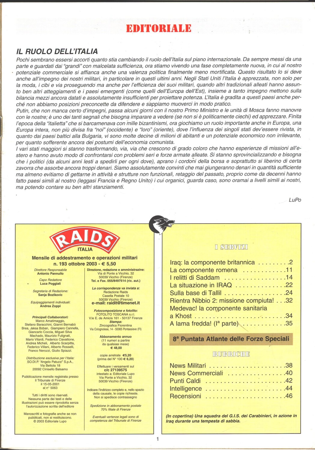 | Titolo: | Rivista Raids n. 193 – Ottobre 2003 – In copertina squadra G.I.S. dei Carabinieri ed. Albertelli |
