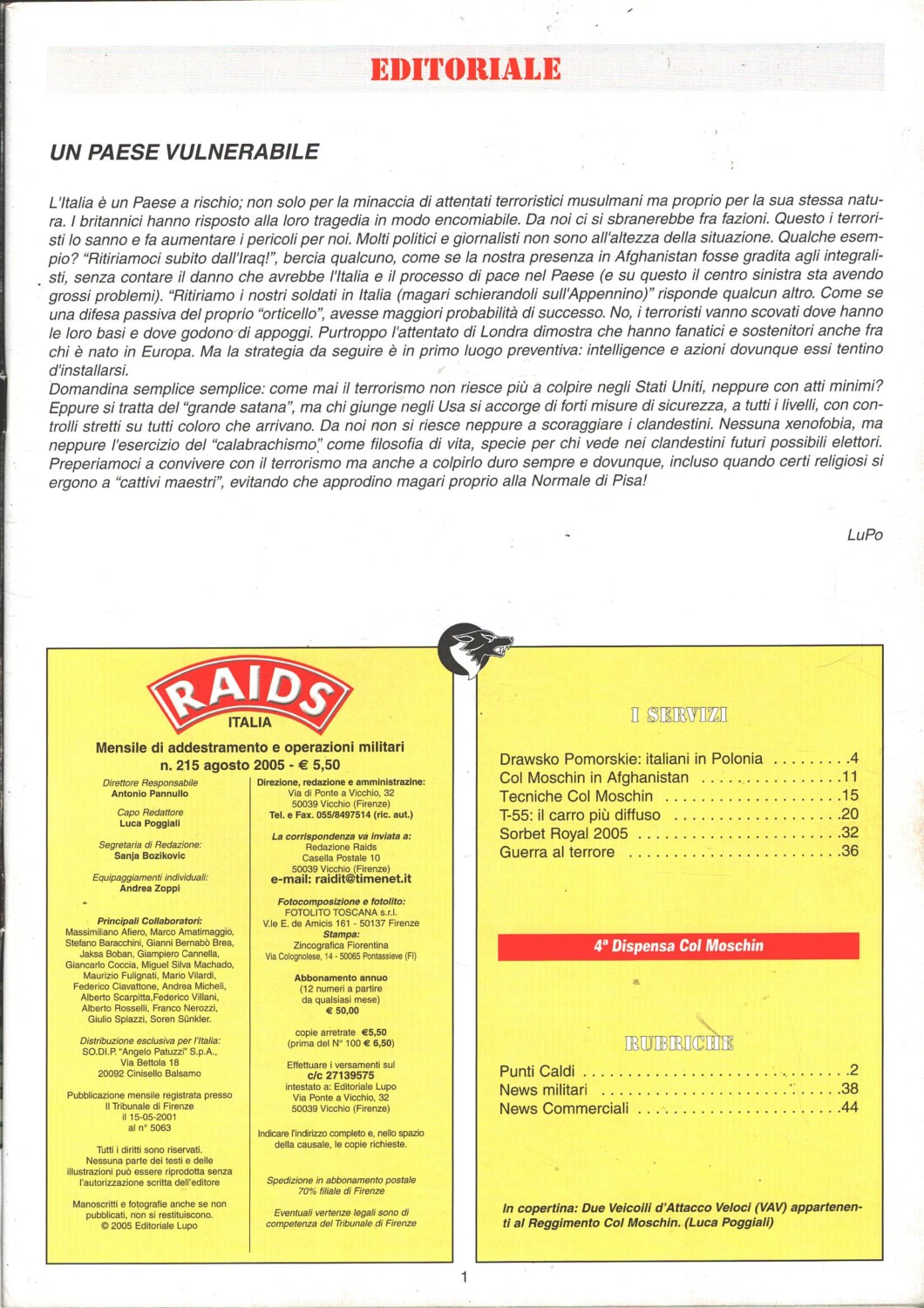 | Titolo: | Rivista Raids n. 215 – Agosto 2005 – In copertina Veicoli Attacco Veloci ed. Albertelli |