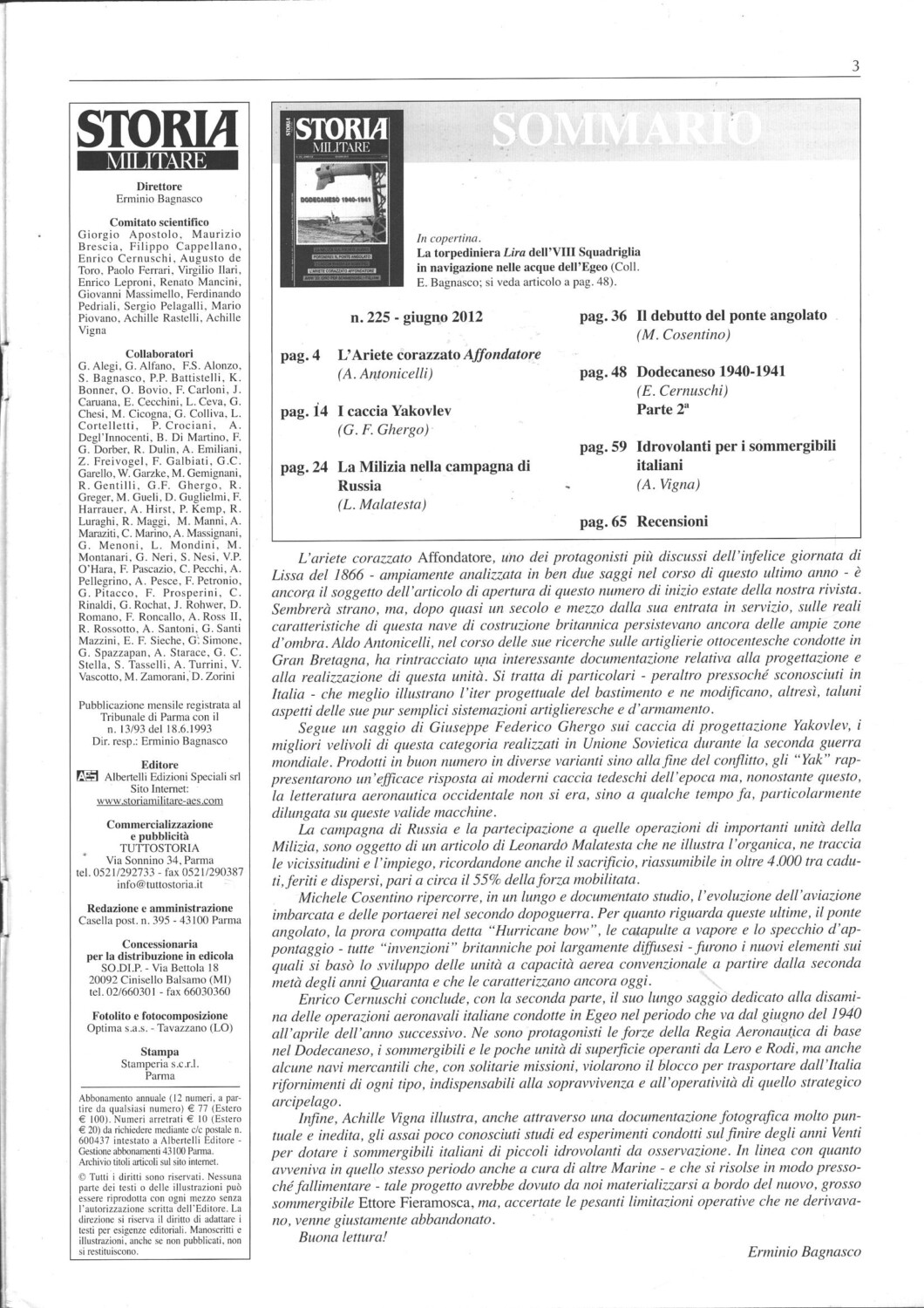 Rivista Storia Militare n. 225 – Giugno 2012 – In copertina torpediniera Lira ed. Albertelli