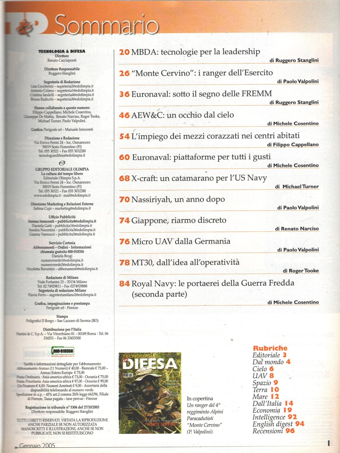 | Titolo: | Rivista Tecnologia & Difesa n. 10 – Gennaio 2005 – In copertina ranger 4° reggimento Alpini Paracadutisti ed. Olimpia |
