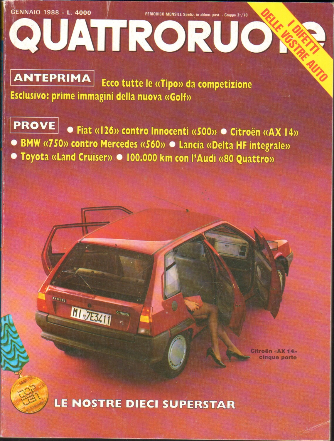 | Titolo: | Quattroruote 1988 Gennaio n. 387 – Citroen AX 14, Toyota Land Cruiser, BMW 750, FF06 |