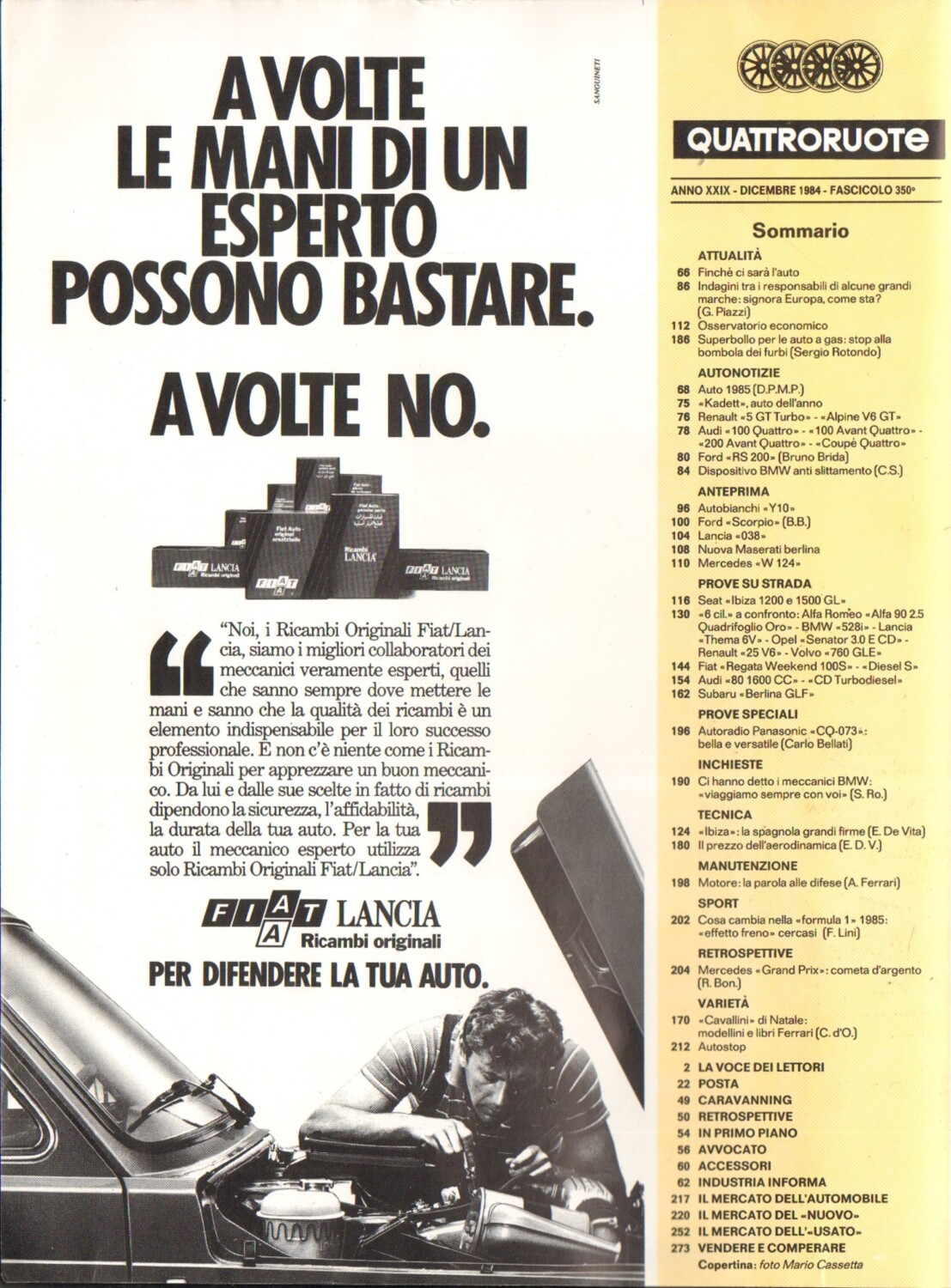 | Titolo: | Quattroruote n. 350 Dicembre 1984 – Alfa 90, Lancia Thema, Seat Ibiza, Fiat Regata |