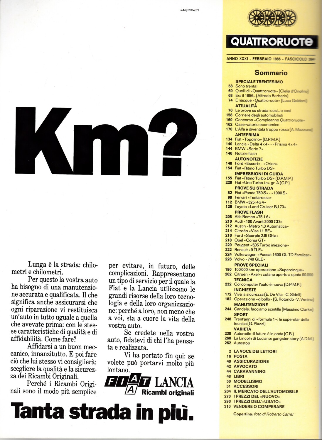 | Titolo: | Quattroruote n. 364 Febbraio 1986 – Ferrari Testarossa, BMW 325i 4×4, Axel |
