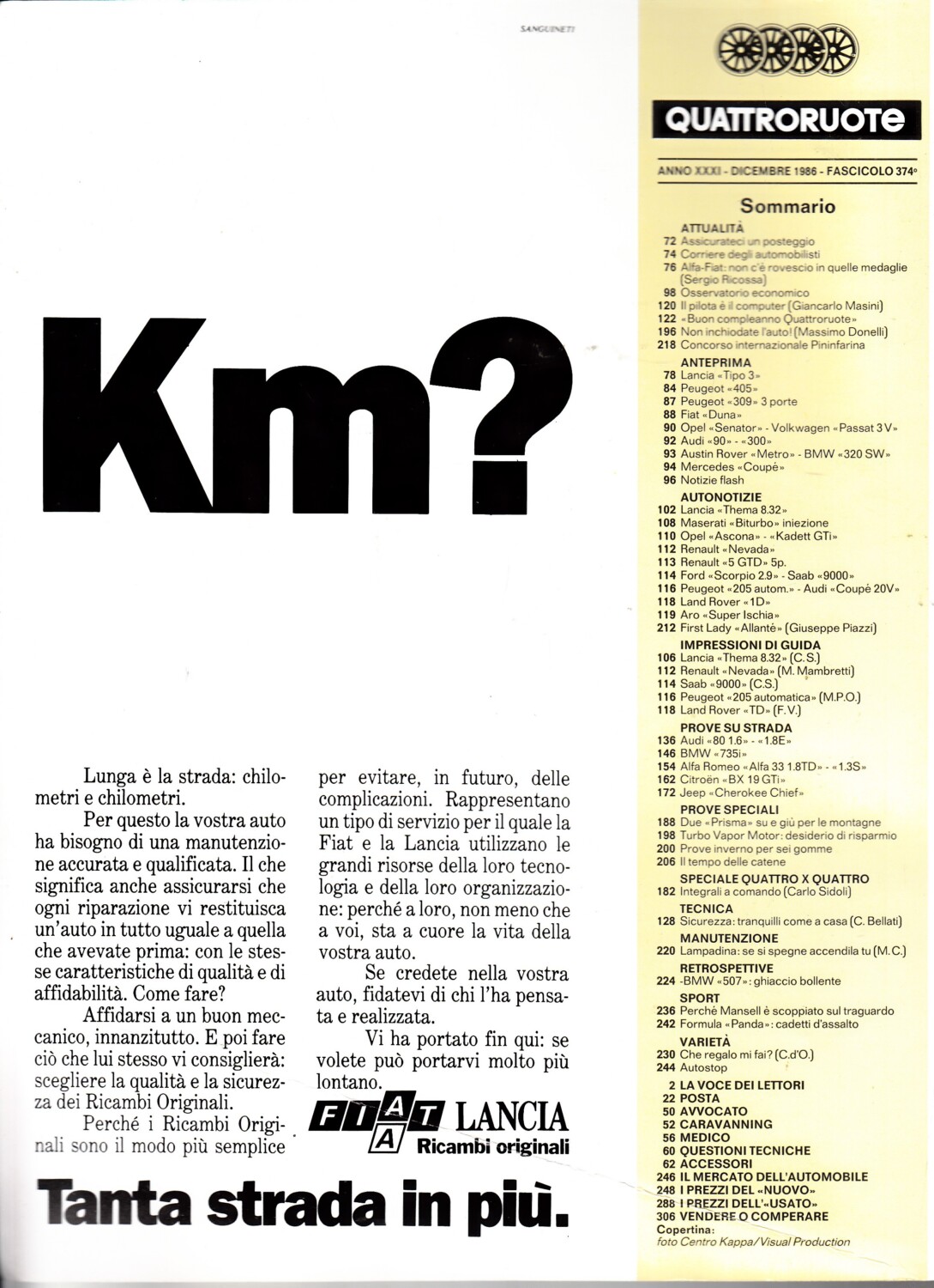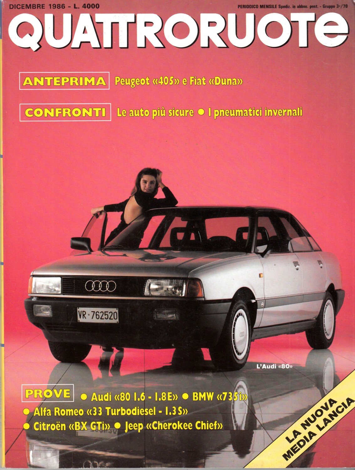 | Titolo: | Quattroruote n. 374 Dicembre 1986 – Jeep Cherokee Chief, Citroen BX GTi, Audi 80 |