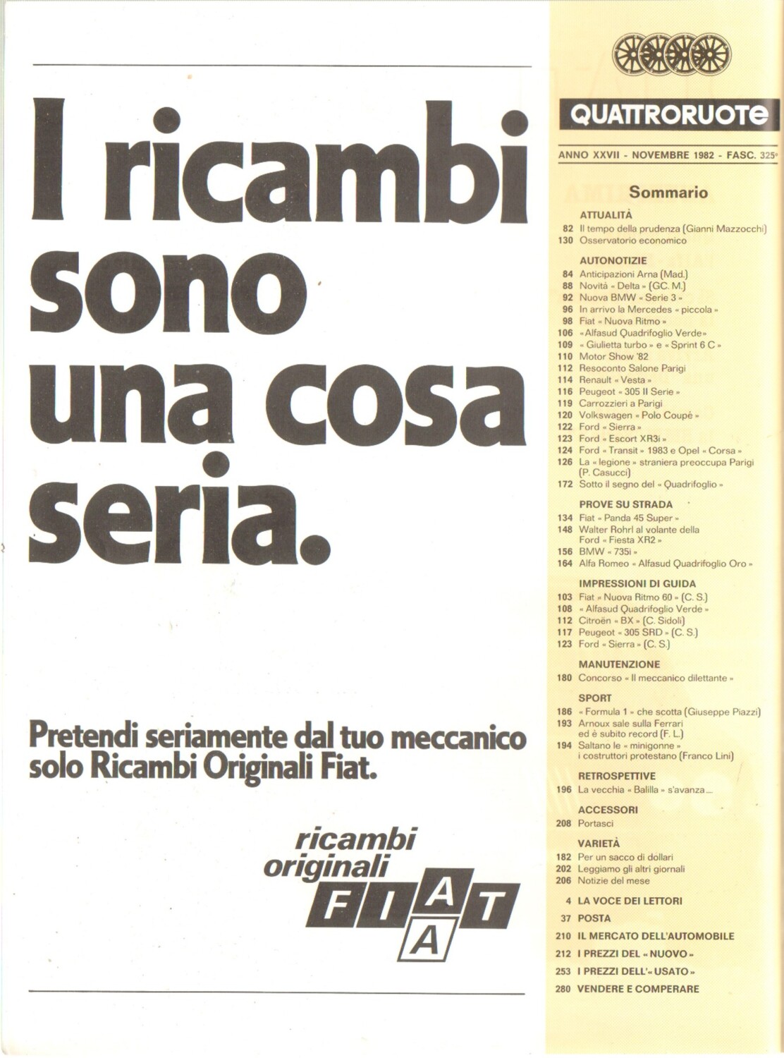 | Titolo: | Quattroruote n. 325 Novembre 1982 – BMW 735 iniezione, Ford Fiesta XR2, Fiat Panda |