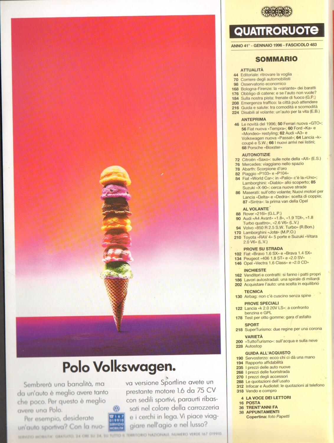 | Titolo: | Quattroruote n. 483 Gennaio 1996 – Prove Fiat Bravo 1.6 SX e Brava 1.4 SX, Opel |