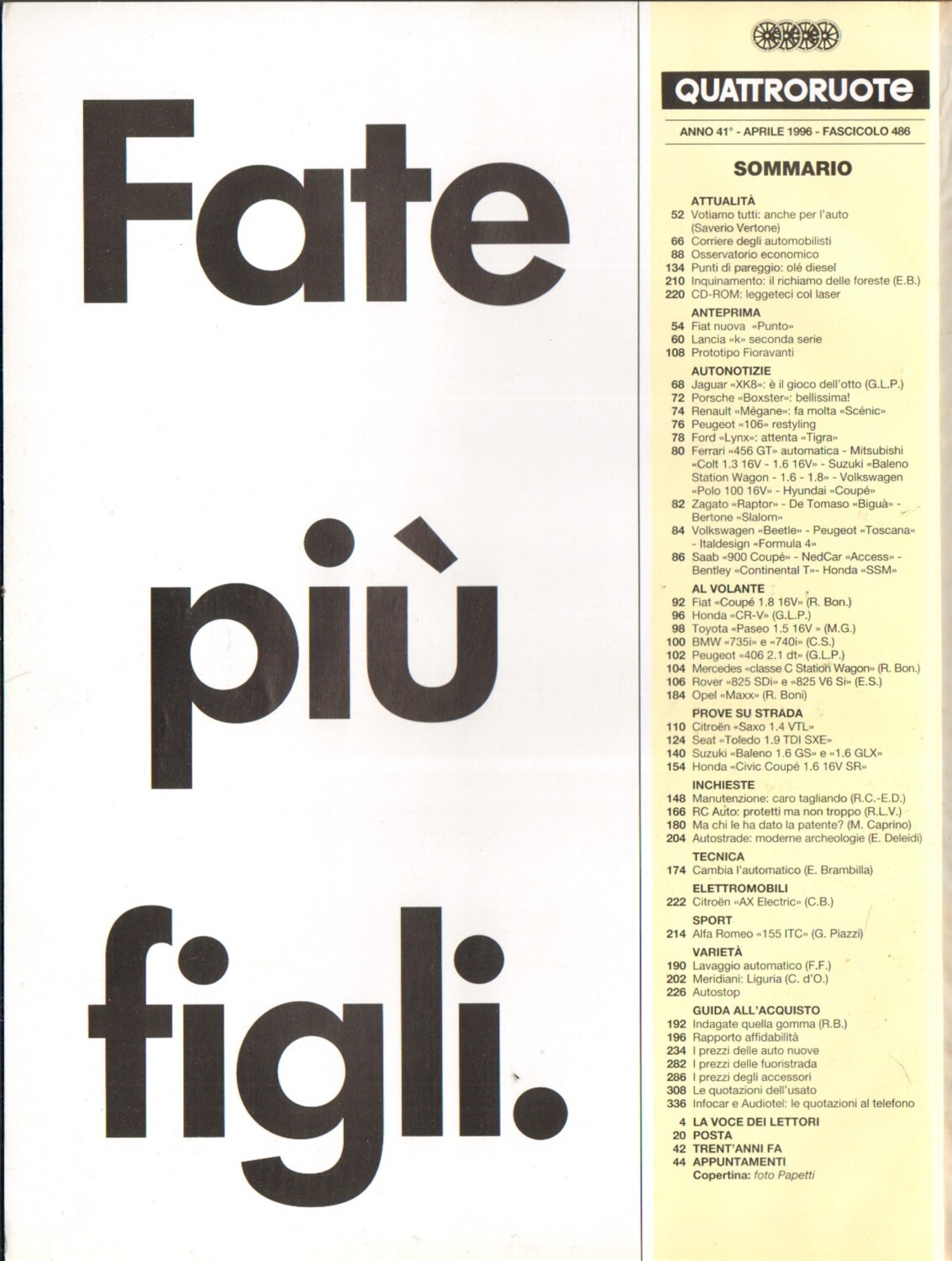 | Titolo: | Quattroruote n. 486 Aprile 1996 – Citroen Saxo, Seat Toledo, Suzuki Baleno |