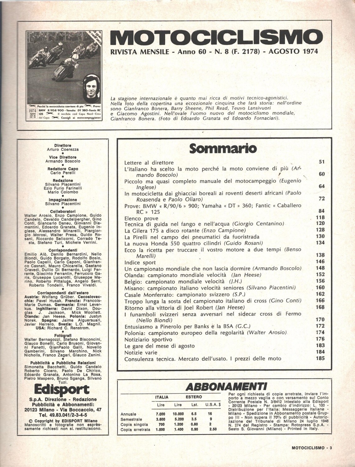 | Titolo: | Rivista Motociclismo n. 8 – Agosto 1974 ed. Edisport |