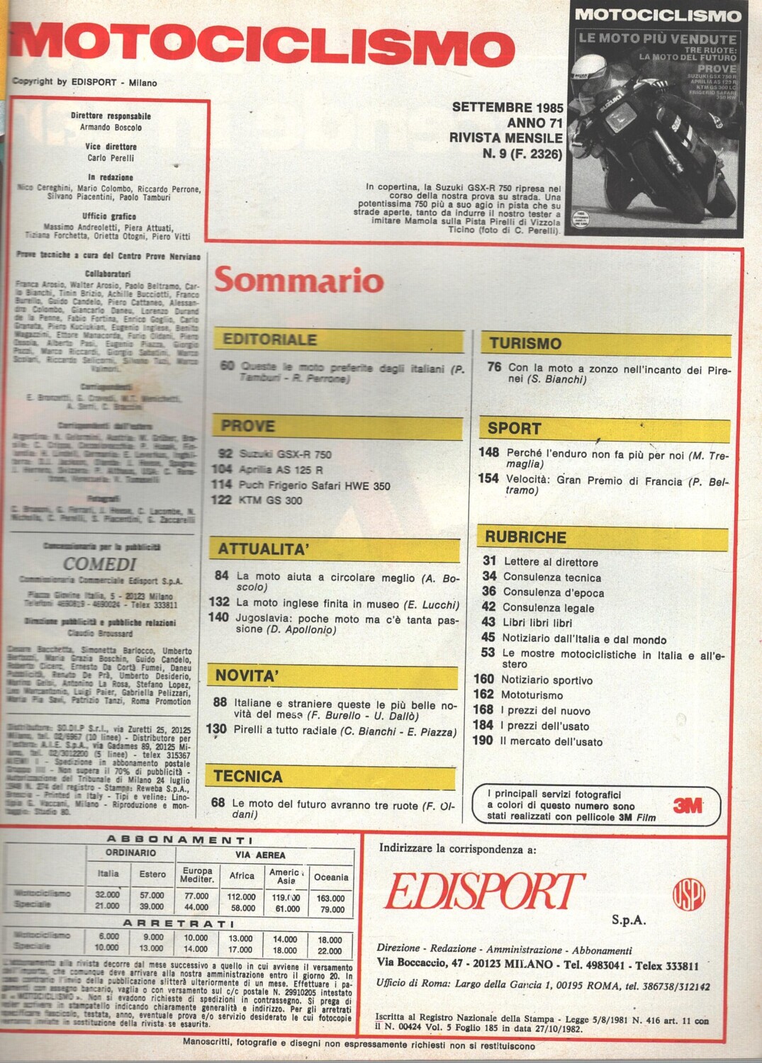 | Titolo: | Rivista Motociclismo n. 9 – Settembre 1985 ed. Edisport |