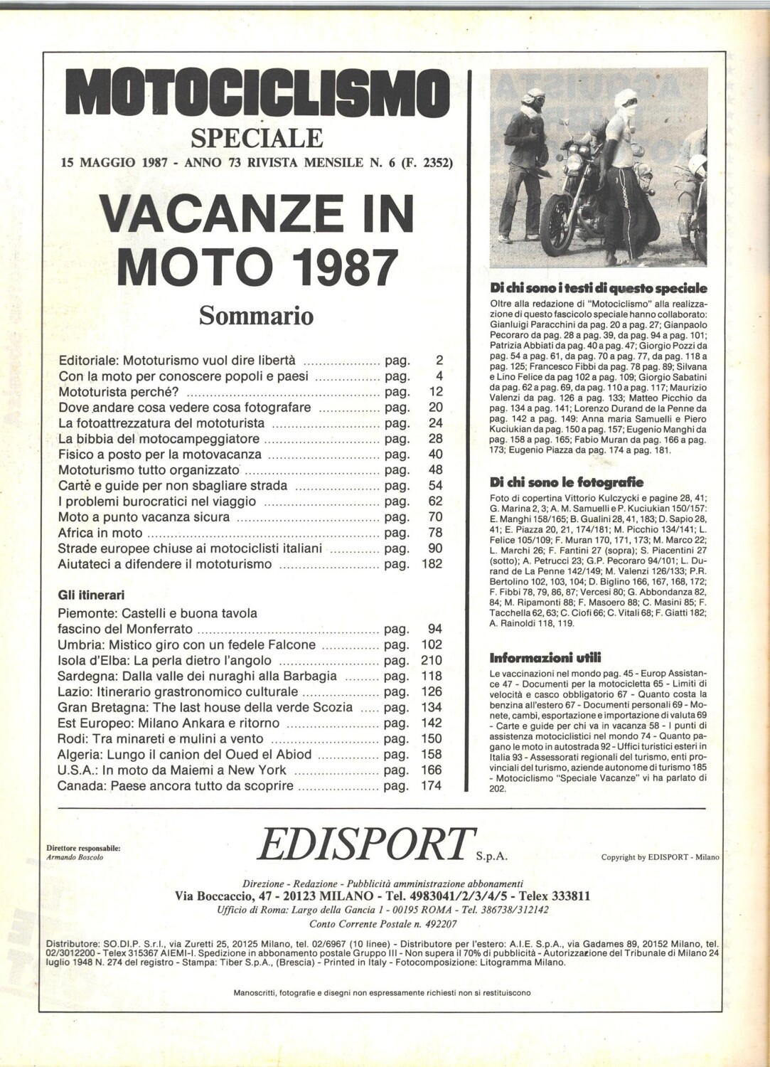 | Titolo: | Rivista Motociclismo Speciale n. 2 – Maggio 1987 – Vacanze in moto ed. Edisport |