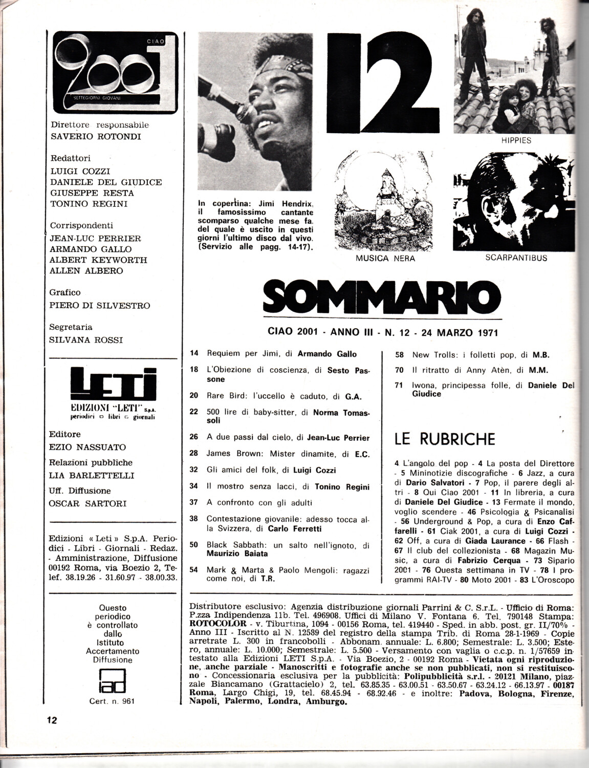 | Titolo: | Rivista Ciao 2001 Anno 1971 n. 12 del 24 Marzo – In copertina Jimi Hendrix + Poster |