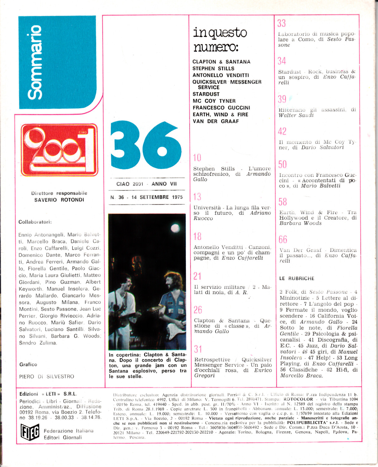 | Titolo: | Rivista Ciao 2001 Anno 1975 n. 36 del 14 Settembre – In copertina Santana e Clapton |