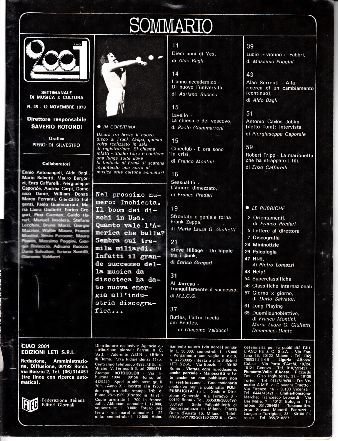 | Titolo: | Rivista Ciao 2001 Anno 1978 n. 45 del 12 Novembre – In copertina Frank Zappa |