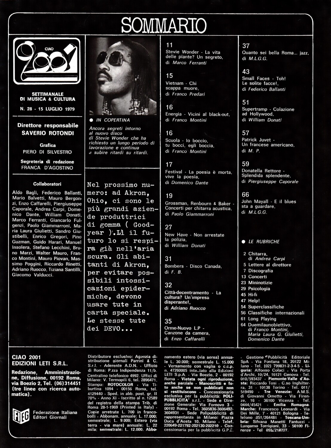 | Titolo: | Rivista Ciao 2001 n. 28 del 15 Luglio 1979 – In copertina Steevie Wonder |